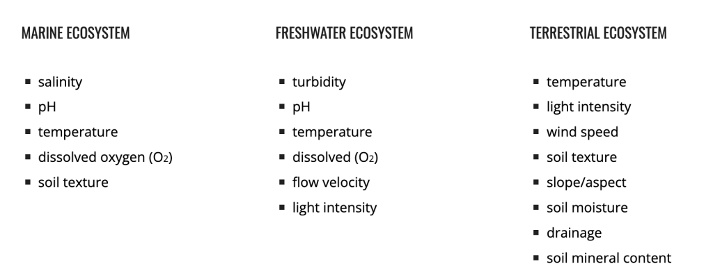 - Salinity – Affects osmoregulation in aquatic organisms, especially in marine and freshwater ecosystems.