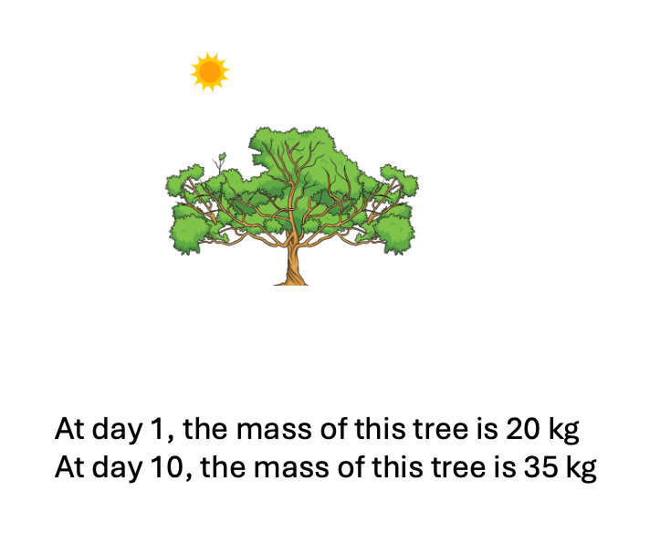 In the above figure, it is shown that the tree increased its mass from 20 kg to 35 kg. This 15 kg increase is a mixture of biomass and water. To measure the biomass, this three will have to be cut down or at least some parts of it.