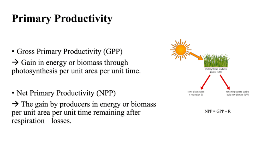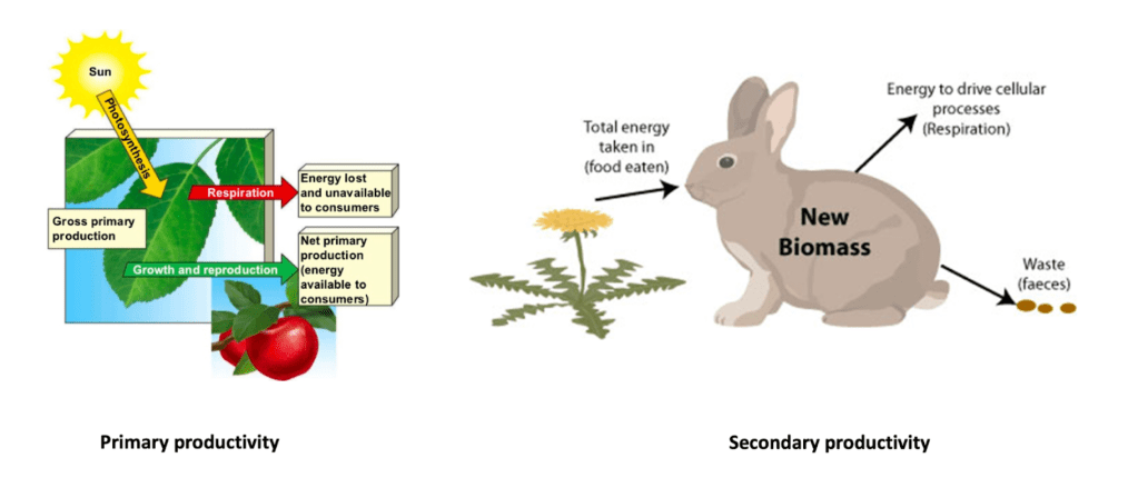 - Depending on where productivity occurs, it is referred to as primary productivity or secondary productivity