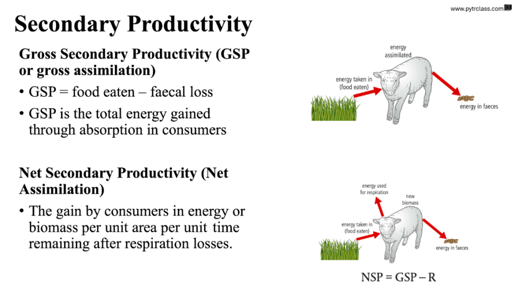 - the biomass gained by heterotrophic organisms, through feeding and absorption, measured in units of mass or energy per unit area per unit time.
