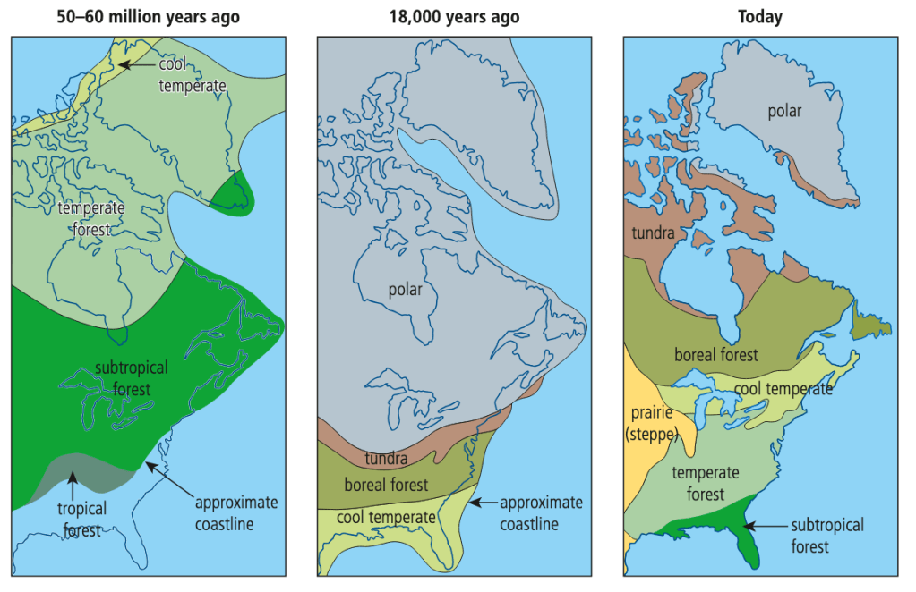 Studying climate change in Earth’s geological history helps us understand how biomes might shift with rising global temperatures in the future. Models predict that biomes will undergo a latitudinal shift, moving north or south relative to the equator. Additionally, biomes will likely migrate up mountain slopes (altitudinal shift). Low-lying biomes, like mangroves, may be lost as a result of rising sea levels.