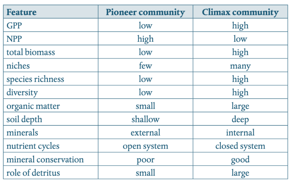 | Timeframe | Early stage of succession; short-lived | Final stage of succession; long-lasting and stable |