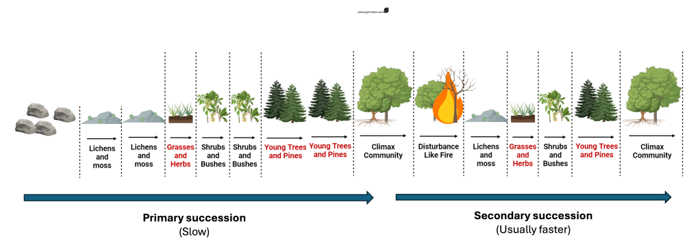 - Secondary Succession – This takes place in areas where an existing community has been disturbed or destroyed, such as after a forest fire, flood, or human activity. Since soil and seed banks are already present, secondary succession happens much faster than primary succession.