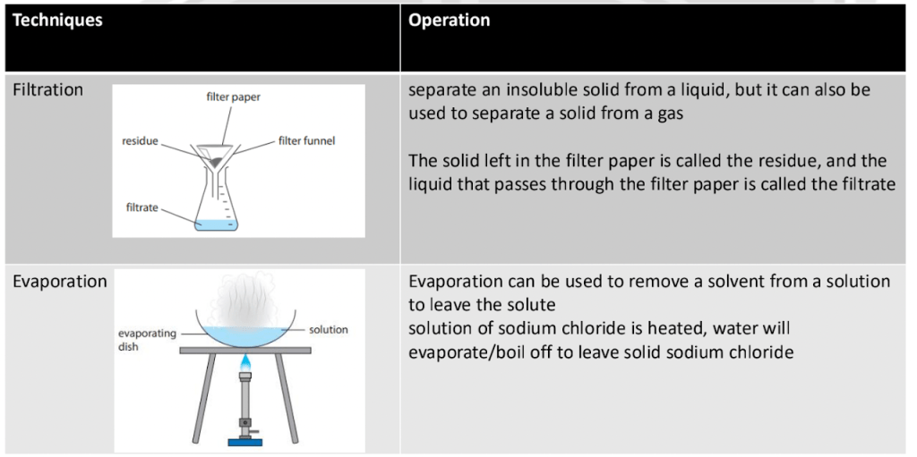 - Define and distinguish between the properties of elements, compounds and mixtures (types of mixtures and separation techniques)