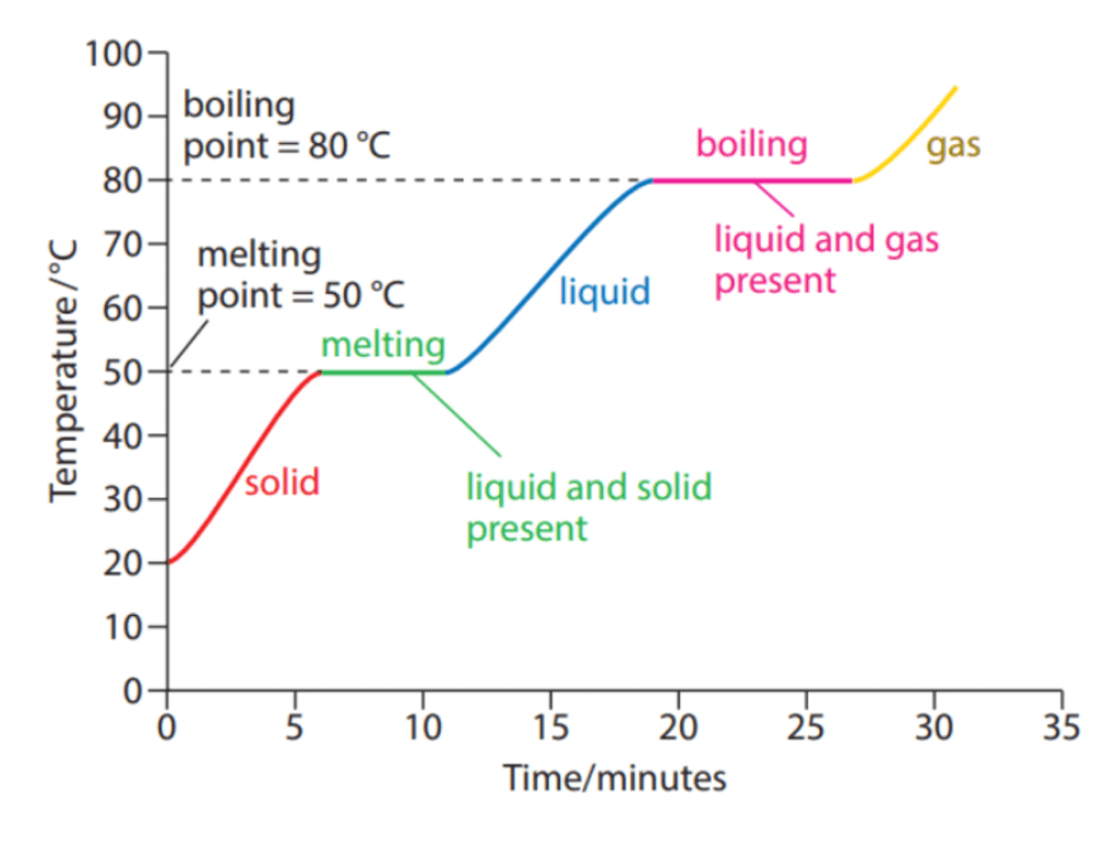 - When all the solid has melted, the liquid form can now start absorbing even higher energy (increasing the temperature) until it reaches the boiling point of the substance. In this case, it was 80oC