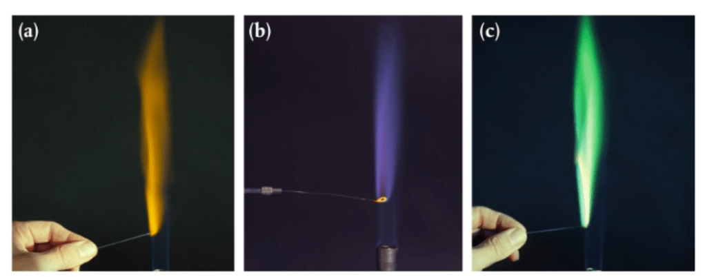 Did you know that the colour of flame correspond to a certain electromagnetic radiation? When burned, electrons are excited and when returned to the original energy level, photon is released. This photon may be visible light, infra-red or UV etc. The above are flame test of Na, K and Cu. These metals produce the same colour when used in fireworks