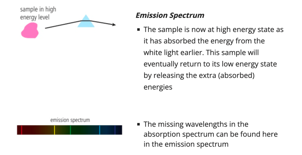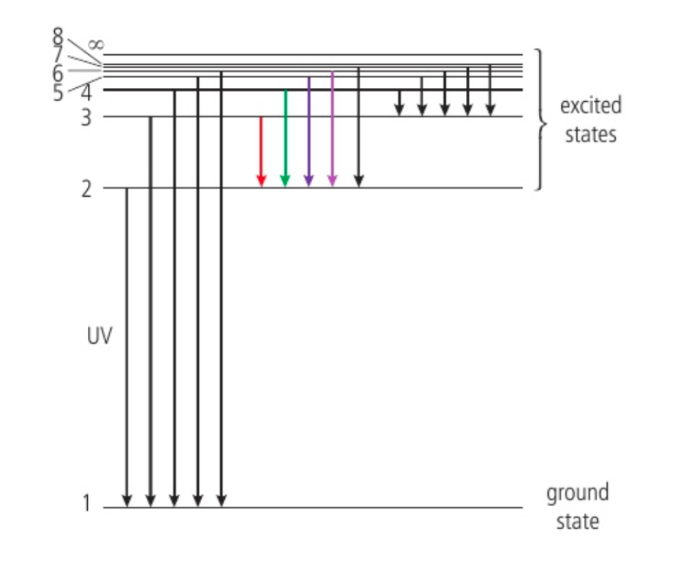 - The red line is the lowest energy level, hence could be the first shell. However, the emission spectrum does not (cannot) show infrared which is also produced as part of the photon.