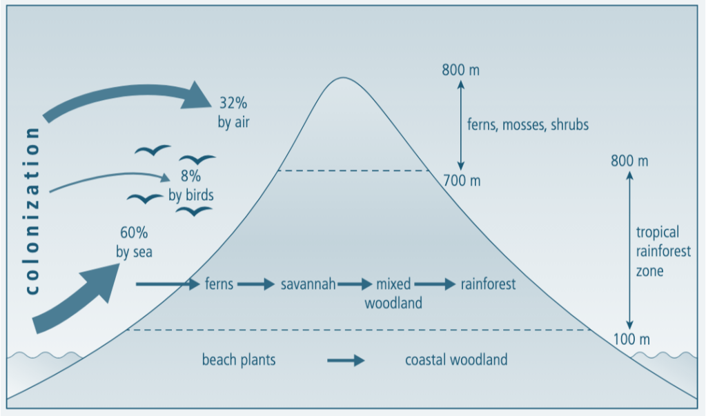 Example: Formation of ecosystems on volcanic lava flows in Hawaii.