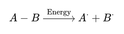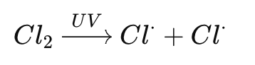- Homolytic fission of chlorine molecule (Cl₂) occurs due to UV light or heat.