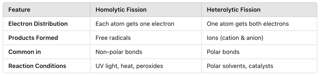 Homolytic fission is the breaking of a covalent bond in which each atom takes one electron from the bond, forming two free radicals.