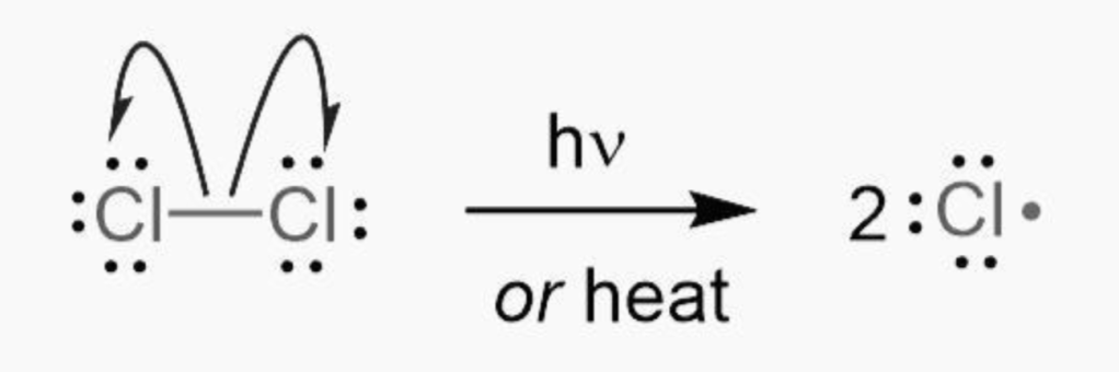 - This produces two chlorine radicals (Cl•) with unpaired electrons.