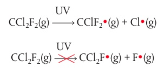 - Although C-Cl bond has lower bond enthalpy than C-F, when UV is absorbed, the C-Cl bond is preferentially broken and no F radical is produced