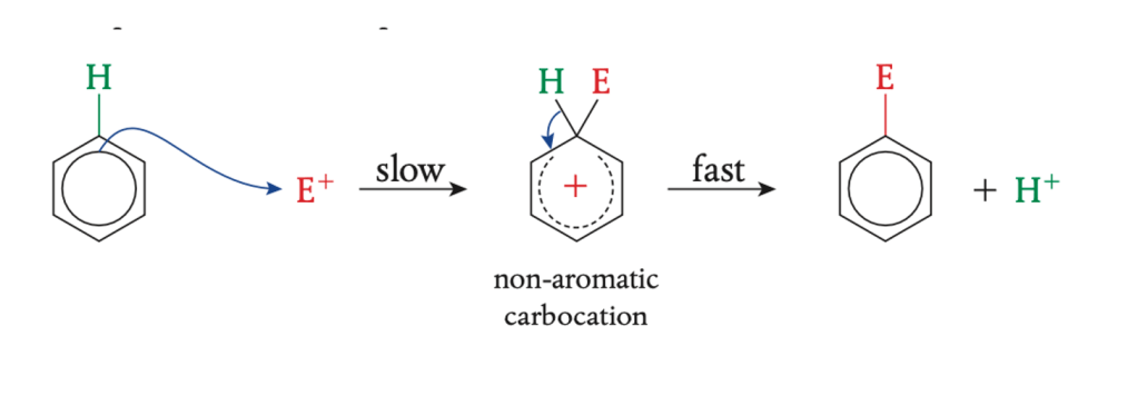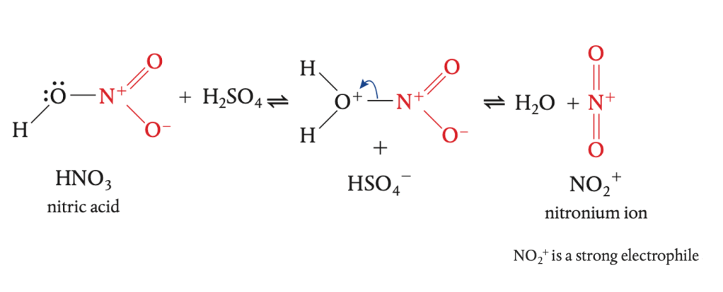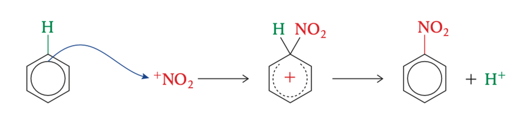 - Describe the mechanism of electrophilic substitution using nitration of benzene