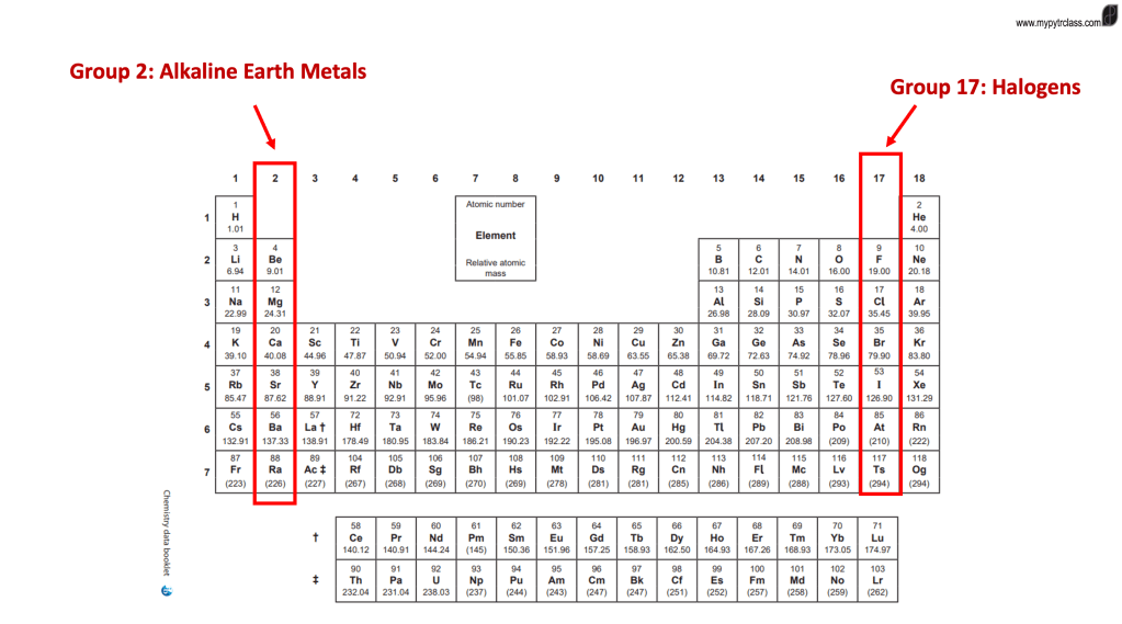 - Identify the groups of alkali metals, alkaline earth metals, transition elements, halogens and noble gasses