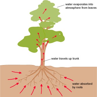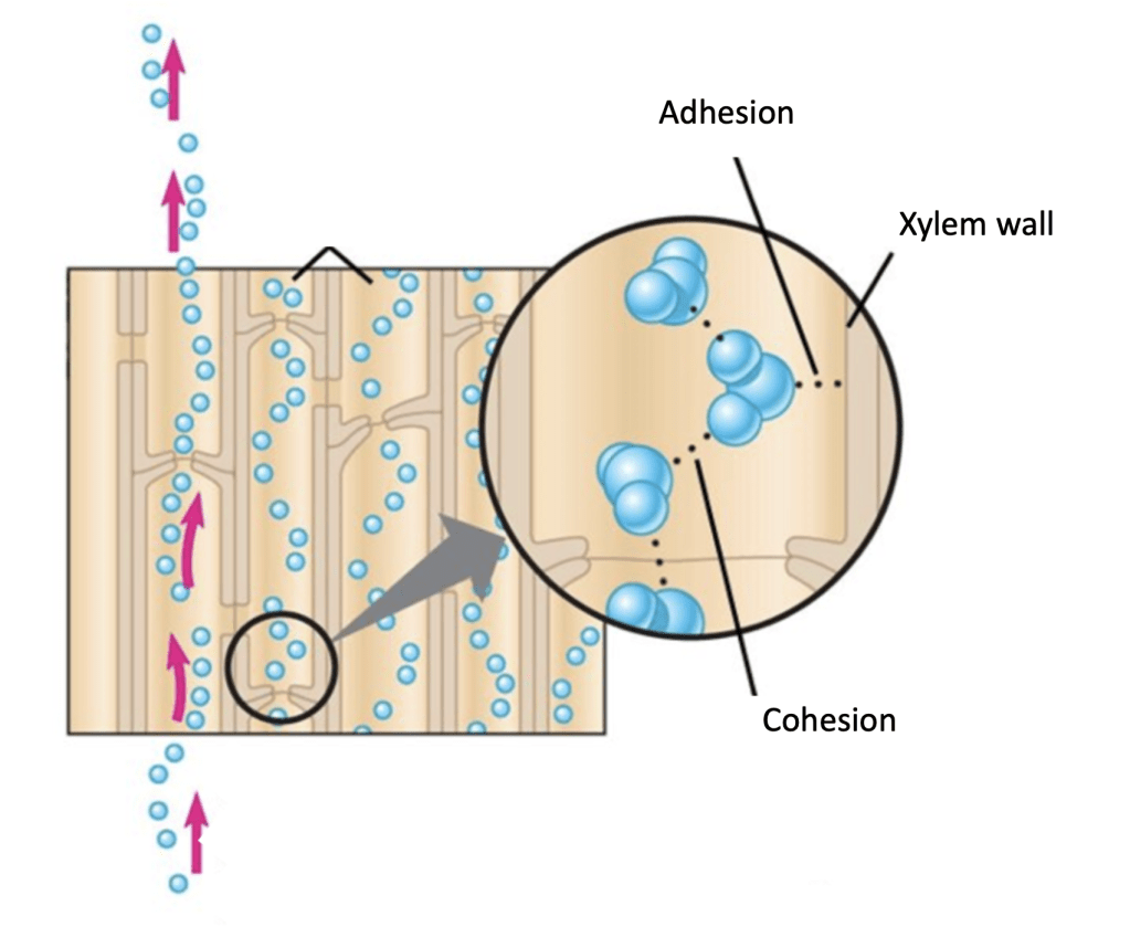 - If water evaporates from cell walls in leaves, adhesive forces draw water from nearby xylem vessels, keeping walls moist for carbon dioxide absorption needed for photosynthesis.