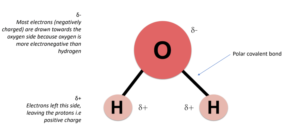 Due to the high electronegativity of O, it pulls the shared electrons towards it making H atoms to be an area of electron deficit (δ+). The O side as the result is now δ– as it is an electron rich region