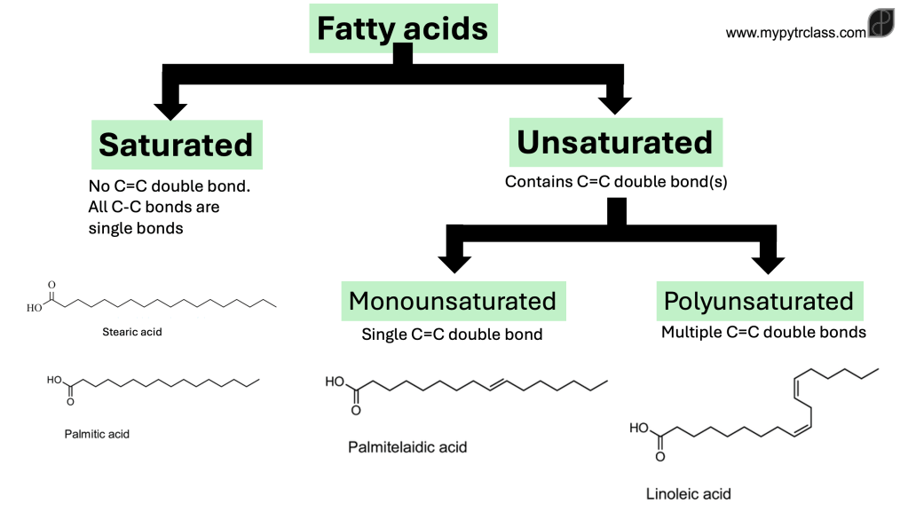 - Differentiate between saturated, monounsaturated, and polyunsaturated fatty acids.