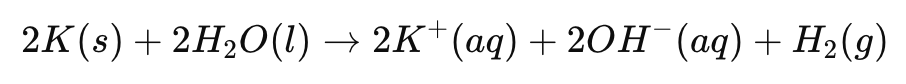 These elements are called alkali metals because the resulting solution is alkaline due to the formation of hydroxide ions (OH⁻). For example, potassium reacts with water as follows:
