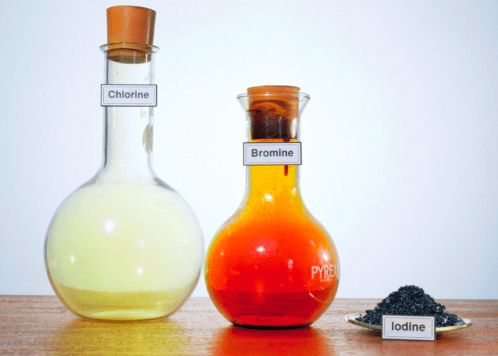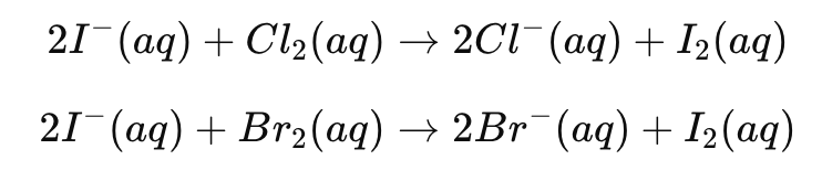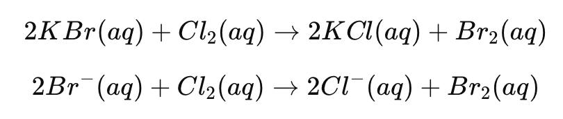For example, when chlorine gas is bubbled through potassium bromide solution, the solution turns orange due to bromine formation: