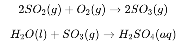 - Further oxidation in the atmosphere produces sulfur trioxide (SO₃), which forms sulfuric acid (H₂SO₄):