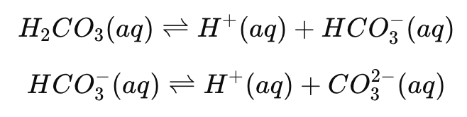 Carbonic acid further dissociates into hydrogencarbonate (HCO₃⁻) and carbonate (CO₃²⁻) ions, releasing hydrogen ions (H⁺) that increase ocean acidity: