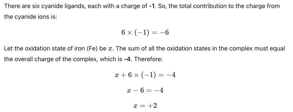 Therefore the oxidation states of all atoms in [Fe(CN)6]4- are: