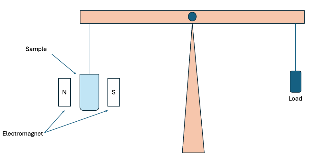 The above setup is called the Gouy balance. When the sample is exposed to a magnetic field, it show reveal its magnetism. Strong magnetic substance will produce magnetic field proportionate to, or stronger than, the applied magnetic field. This will cause the sample to increase its mass. In contrast, weak magnetic substance will decrease its mass.