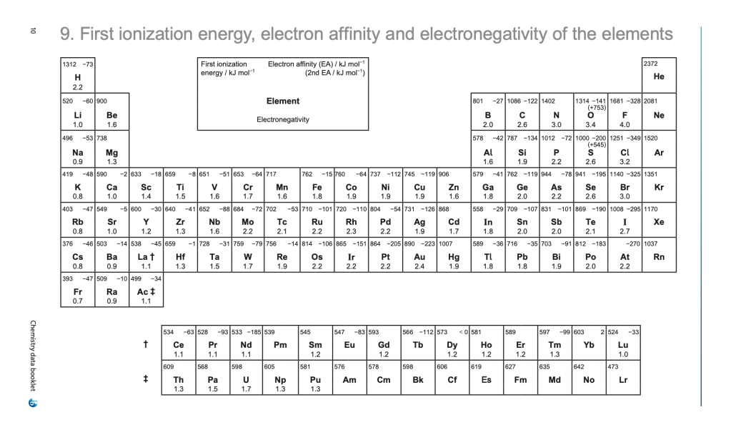 | Sodium (Na) | 11 | 496 | Sharp drop due to the electron being in a new, higher energy 3s orbital. |