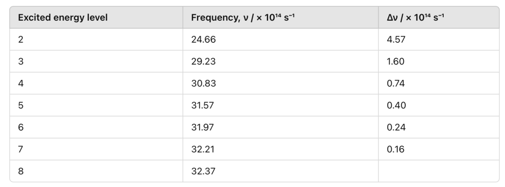 The table below presents the frequencies of spectral lines in the Lyman series. Each transition corresponds to an electron moving from an excited state (n ≥ 2) down to the n = 1 energy level. The third column displays the difference in frequency between successive lines.