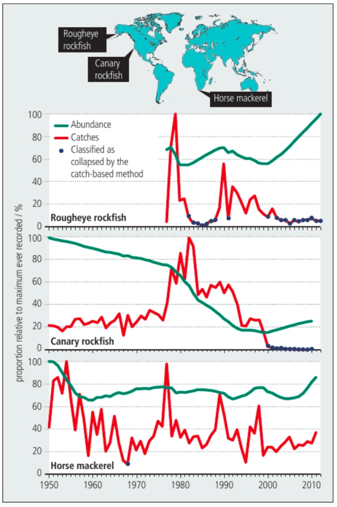 - E.g., 34 USA West Coast stocks seemed collapsed due to low catches, but only 3 had truly collapsed.