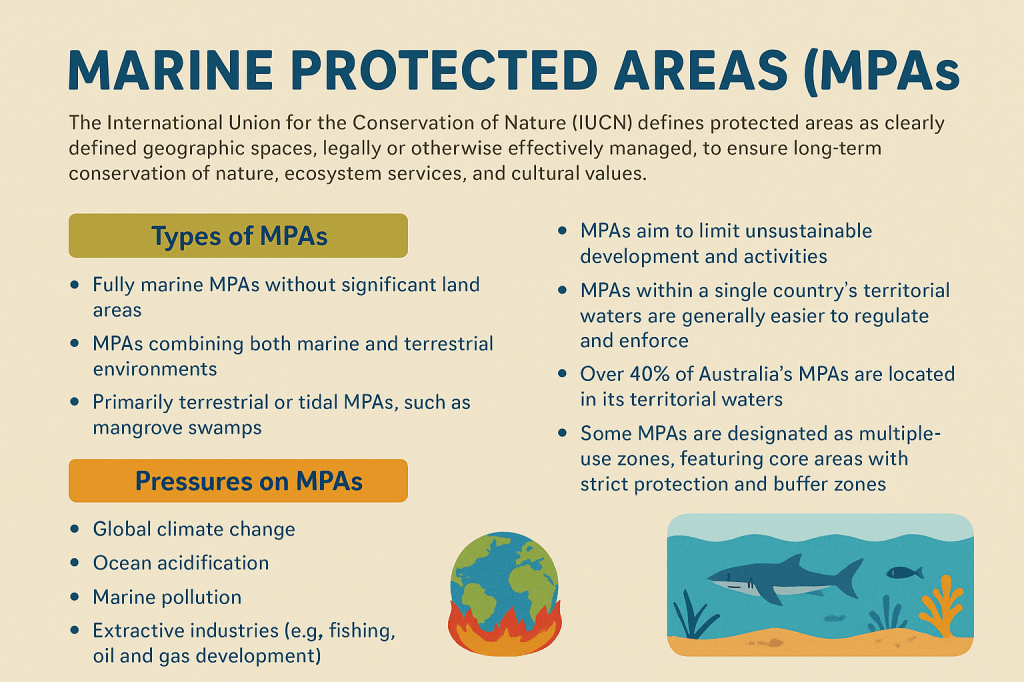 - Marine Protected Areas (MPAs) = designated zones where certain human activities are restricted. in: