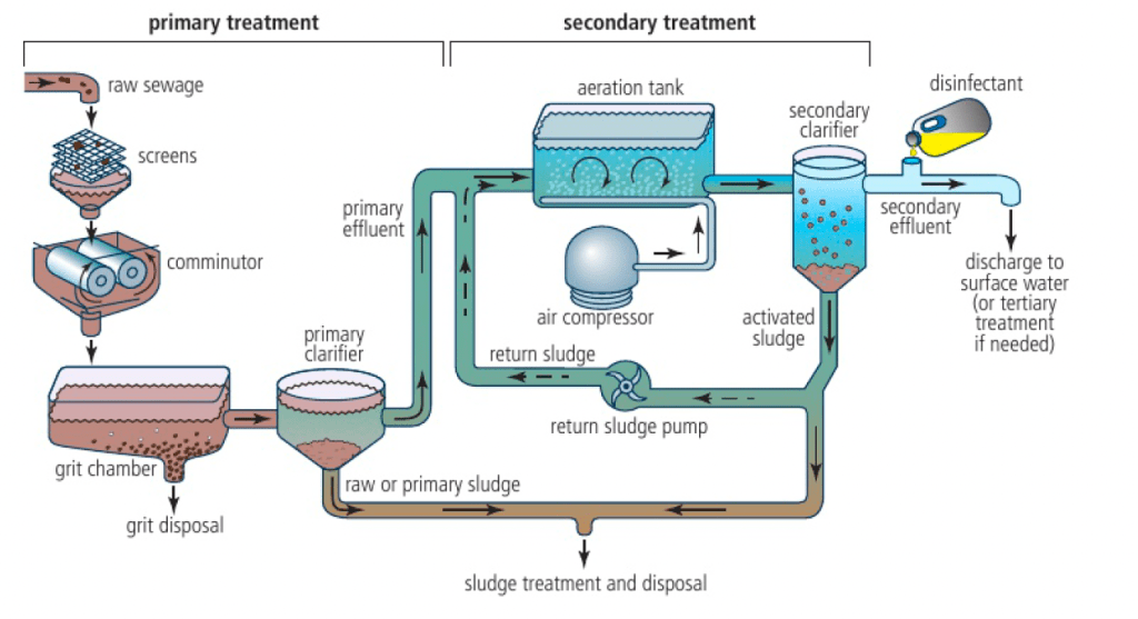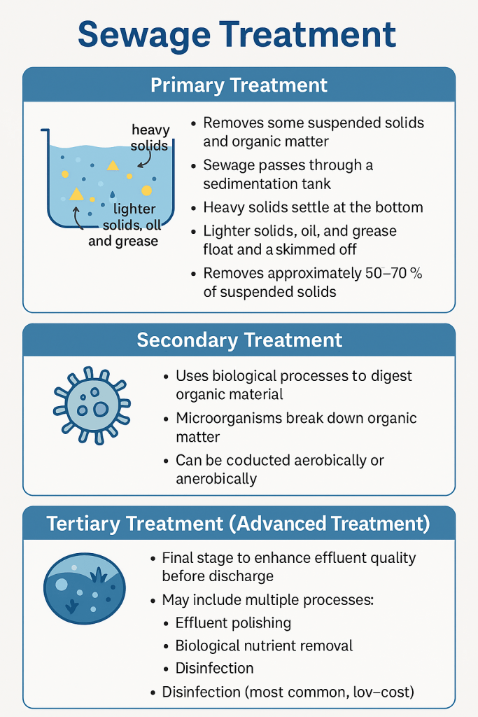 - [AHL] Describe the primary, secondary, and tertiary stages of sewage treatment and their purposes.