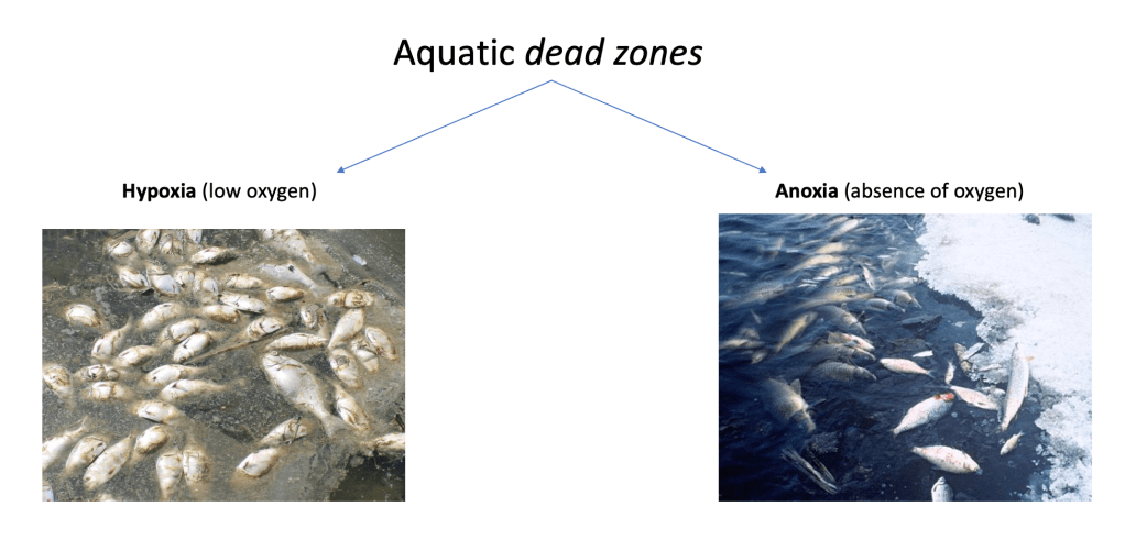 - Hypoxia (low oxygen) and anoxia (absence of oxygen) can create aquatic dead zones.