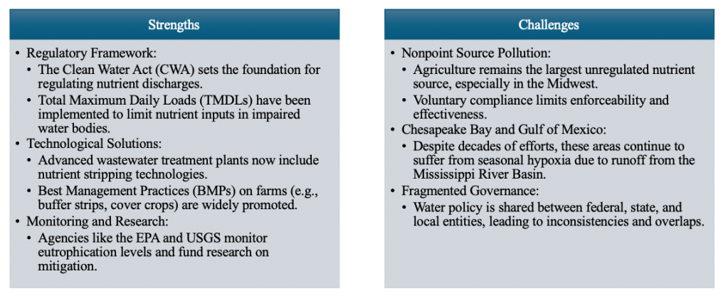 - The USA has strong regulation of point sources but struggles with nonpoint pollution and decentralised governance.