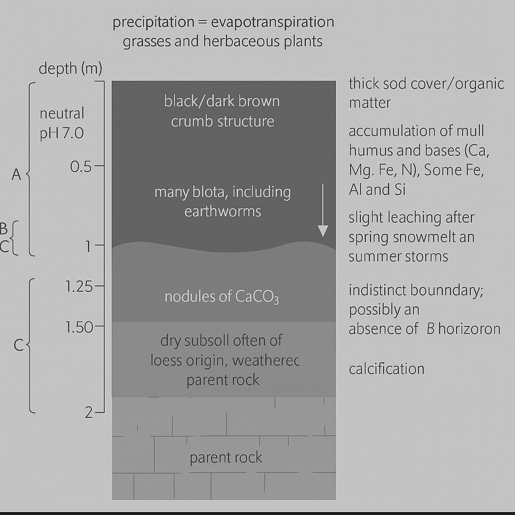 - High organic matter, dark, fertile, base-rich.