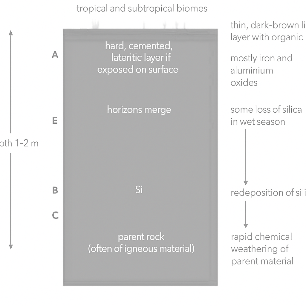 - Highly weathered, acidic, low fertility.