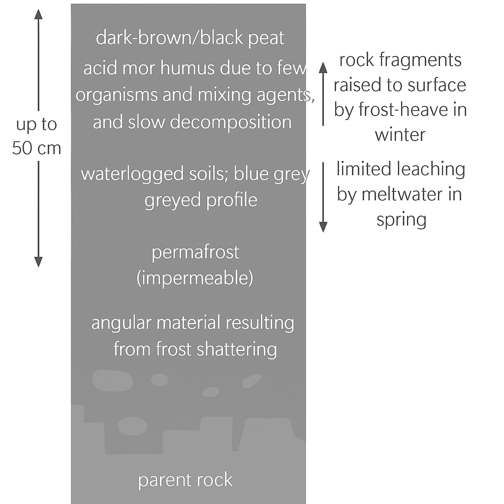 - Frozen/waterlogged, slow decomposition, infertile.