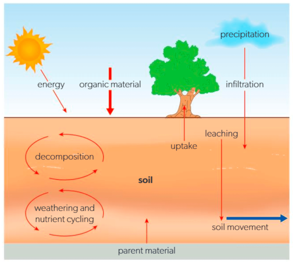 - Describe how transfers occur across soil horizons and between the soil and its surroundings.