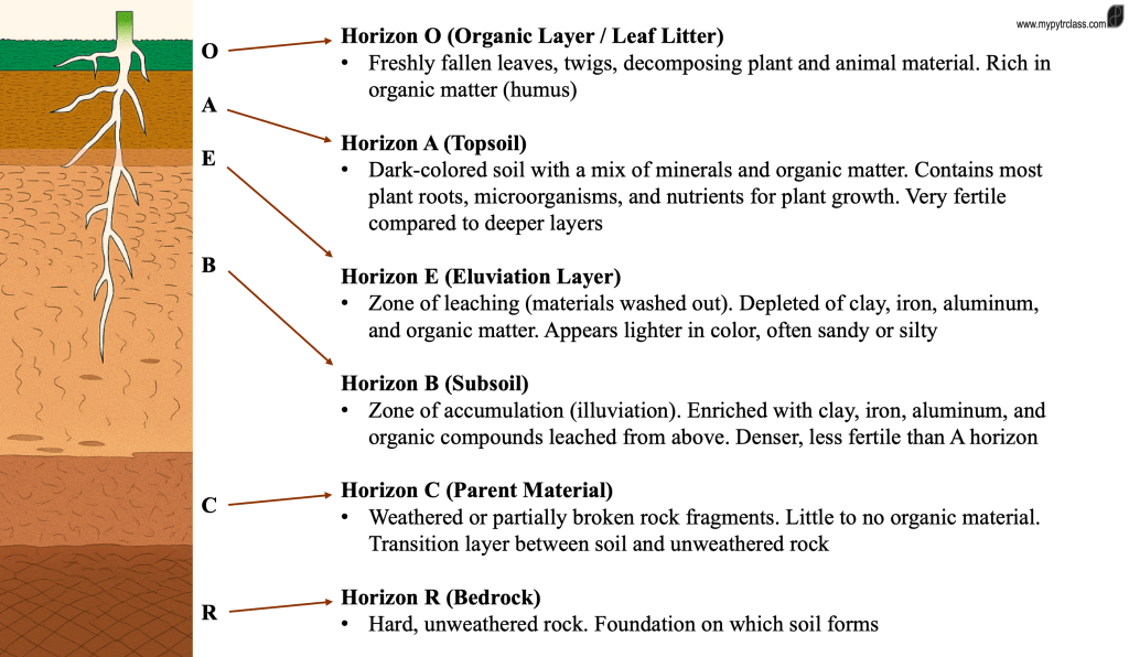Soils develop a stable, layered profile over time as a result of complex interactions among physical, chemical, and biological processes. This vertical arrangement, known as the soil profile, is composed of distinct horizons. These include the O horizon, consisting of organic matter; the A horizon, enriched with minerals and organic material; the E horizon, characterised by the leaching of nutrients; the B horizon, where materials such as clay and iron accumulate; the C horizon, composed of weathered parent material; and the R horizon, which represents unaltered bedrock at the base. Together, these horizons reflect both the processes of soil formation and the environmental conditions in which the soil develops.