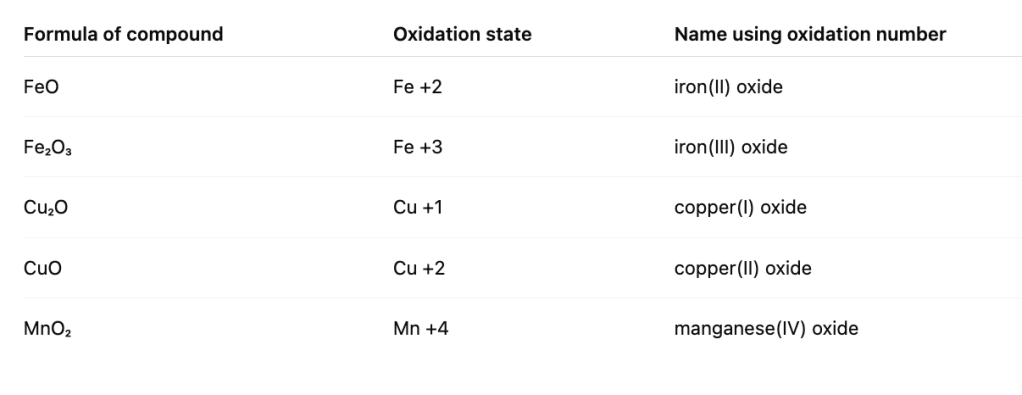 The oxidation number of cation is systematically used when naming ionic compounds. For instance: