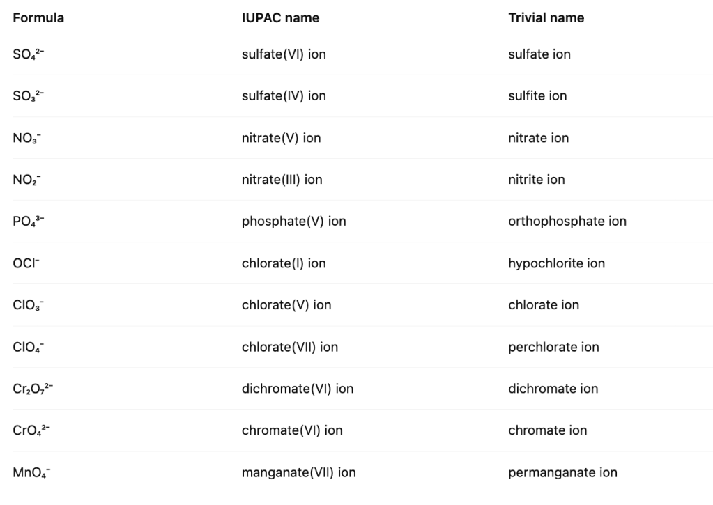 Polyatomic ions consist of two or more atoms that, as a group, have gained or lost electrons to carry an overall charge. Many of these ions occur in salts derived from common acids. The atoms within a polyatomic ion are held together by covalent bonds. For instance, in potassium sulfate, the positively charged K⁺ ions and the negatively charged SO₄²⁻ ions are joined by ionic attraction, while the sulfur and oxygen atoms within the sulfate ion are bonded covalently. The above naming system is called the trivial name. These are still acceptable however when it comes to oxyanions, it might be best to use IUPAC to name the oxyanions. For example: