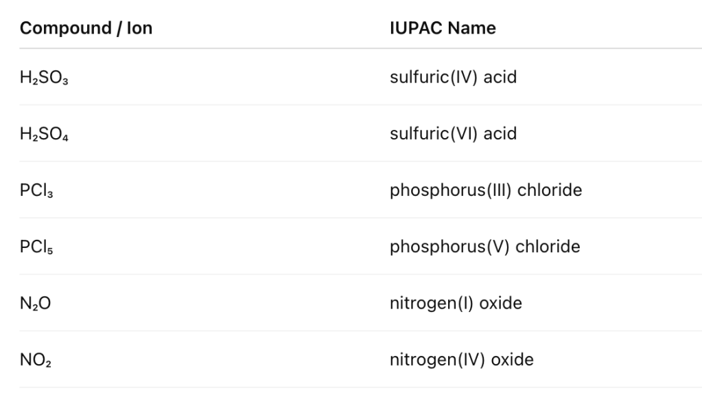 We have already come across several compounds and ions, such as nitric(III) acid, sulfur(IV) oxide, and the sulfate(IV) ion, where Roman numerals appear in the name. These numerals indicate the oxidation state of a particular atom in the compound or ion. Oxidation states are important because they allow us to keep track of electron transfer during redox reactions. They also provide a systematic way to name compounds — for example, distinguishing between nitrogen(I) oxide (N₂O) and nitrogen(II) oxide (NO).