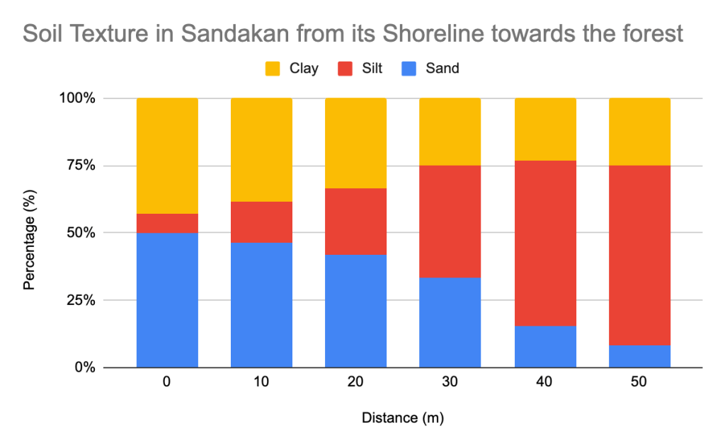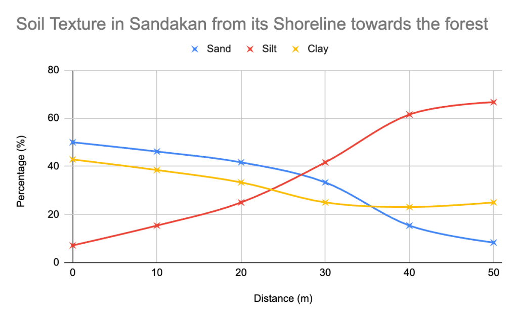- Soil component distribution along the transect and within one zone along the transect. This is part of the independent variable the uncontrolled distribution of biotic and abiotic factor may affect the pattern or trend shown by sand, silt and clay.