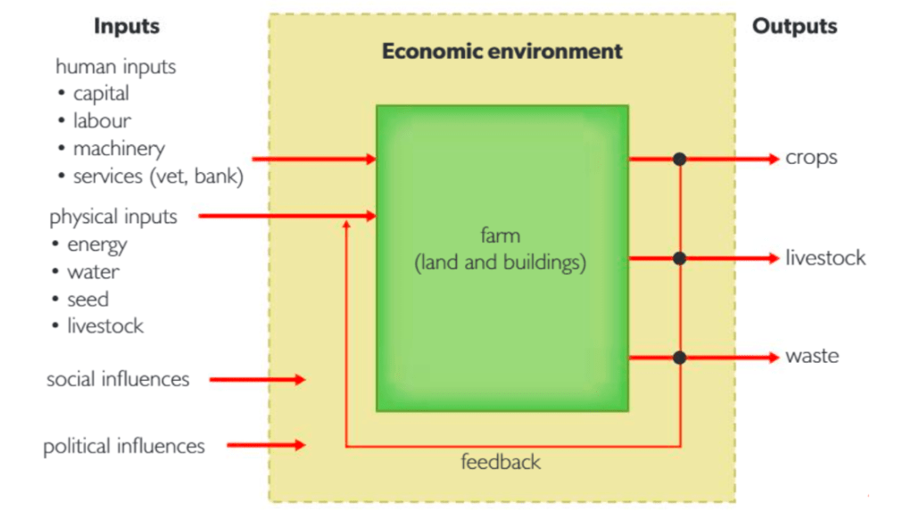 - Outputs of the system – arable (crop-based), pastoral (livestock-based), monoculture, or mixed farming.