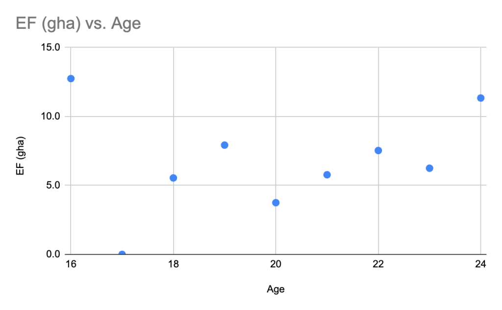 To what extent does increasing age of young adults correlate their ecological footprint (gha) and the percentage of carbon footprint in their ecological footprint?