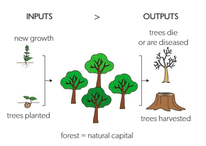Just as economic capital yields economic income, natural capital yields natural income, which refers to the renewable output or services derived from natural systems without depleting the underlying stock. Examples include cherry trees producing fruit, the water cycle providing fresh water, and forests supplying timber.