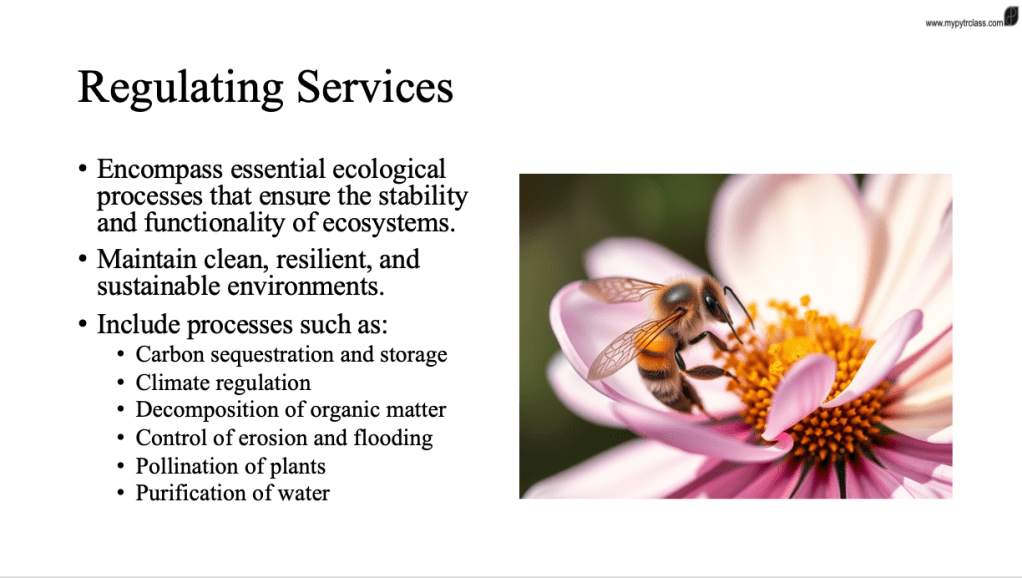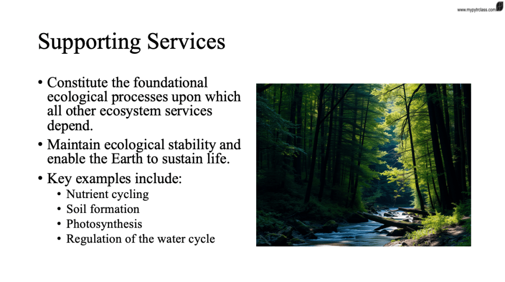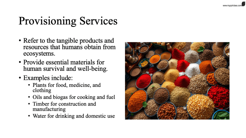 • Services: Natural processes that sustain life, including flood and erosion control by forests, oxygen production through photosynthesis, and the maintenance of ecosystem health.