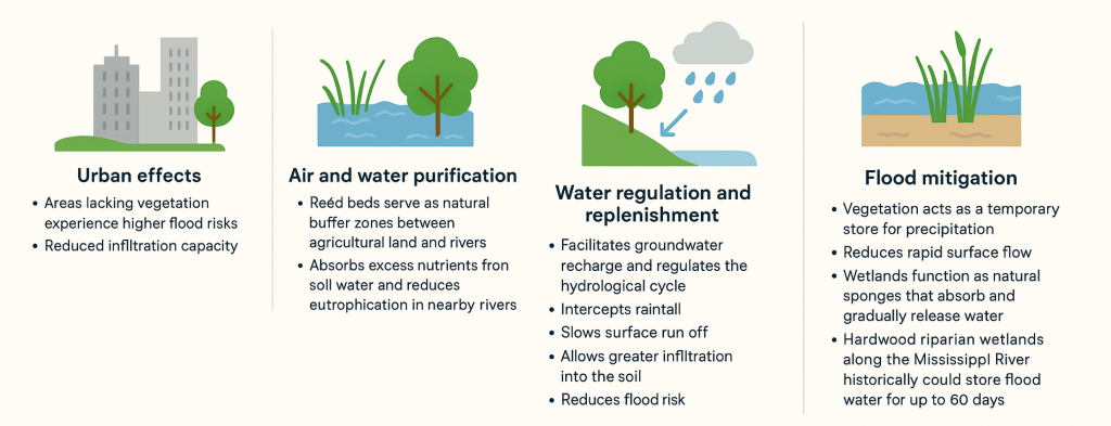 Vegetation contributes both tangible goods such as food, fiber, and medicine and vital life-support services. One key service is water replenishment, whereby vegetation facilitates groundwater recharge and regulates the hydrological cycle. By intercepting rainfall, vegetation slows surface runoff, enhances infiltration, and reduces flood risk and soil erosion.