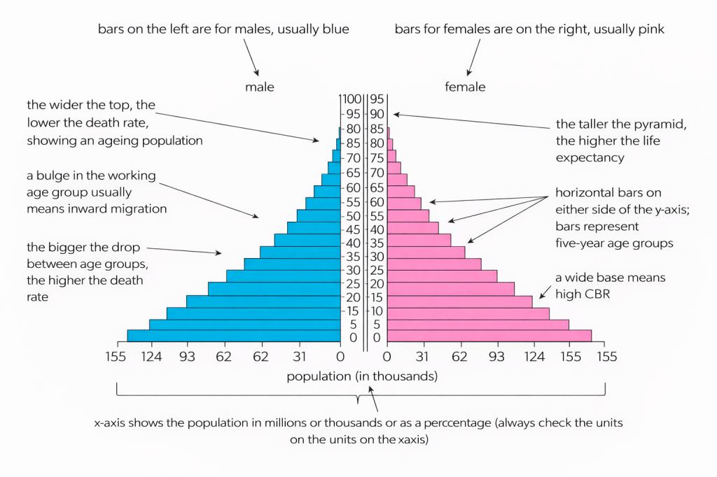 Population pyramids, also known as “age-sex pyramids” or “age-gender pyramids,” are graphical representations used to depict the distribution of a population by age and gender. While they are highly informative, they are not always pyramid-shaped. Population pyramids can take a variety of forms, and there are multiple methods for displaying them. It is important to carefully verify the unit of measurement for the population along the X-axis.